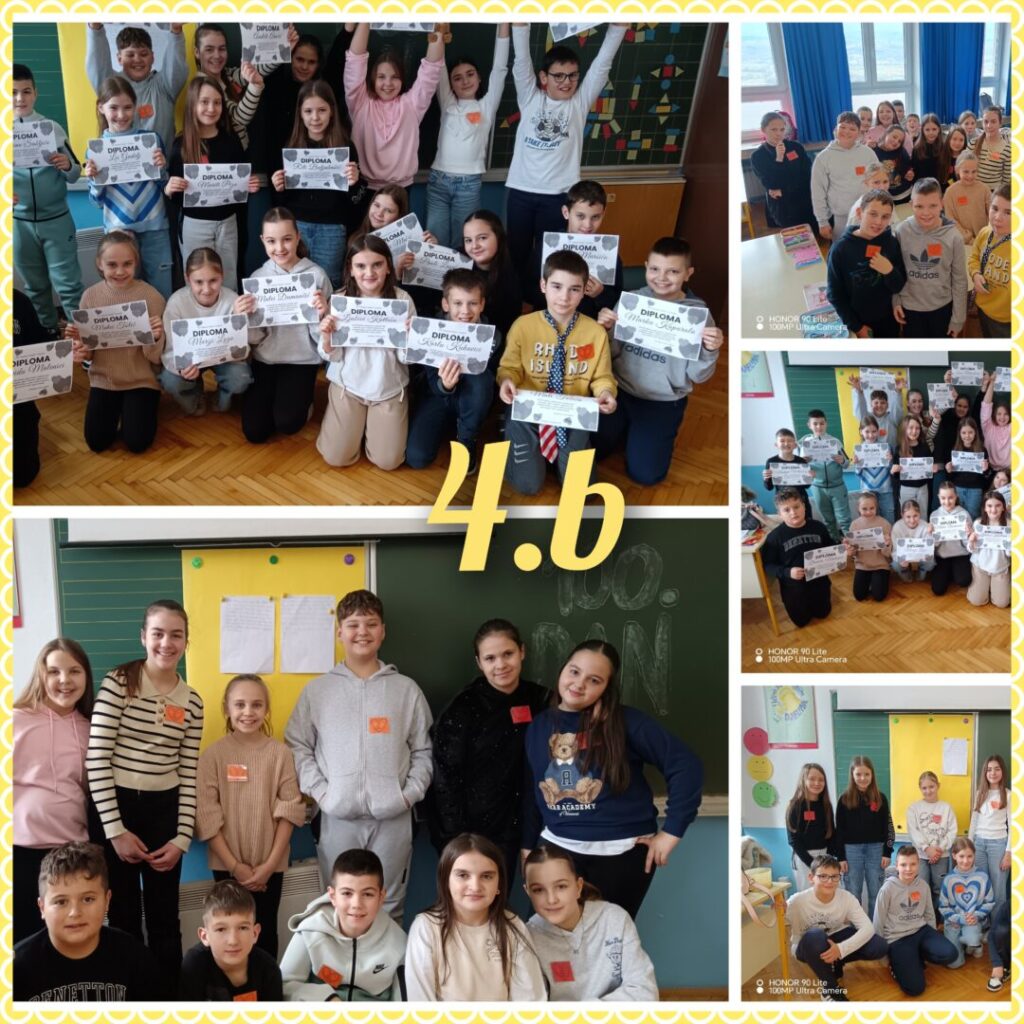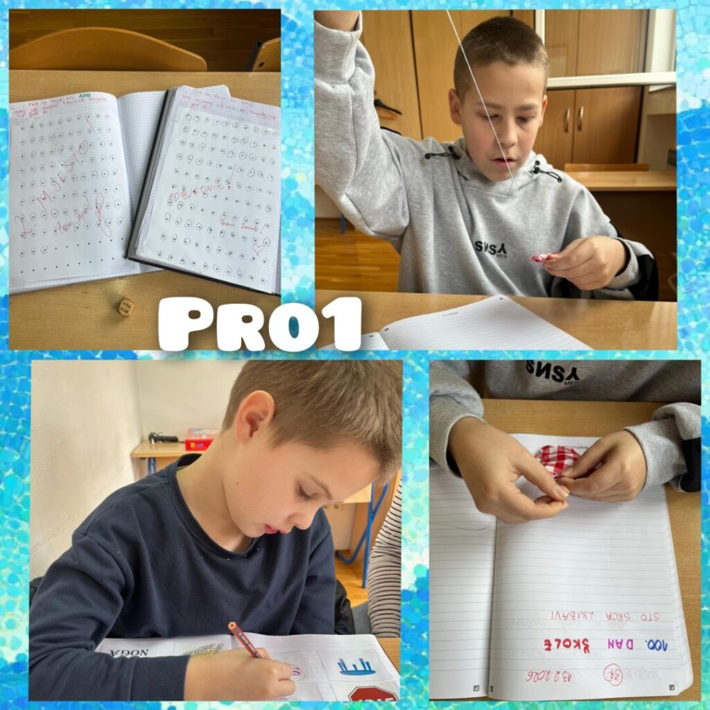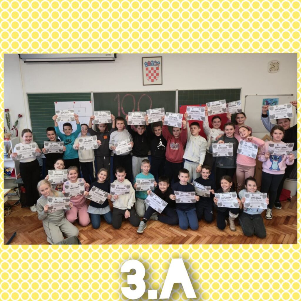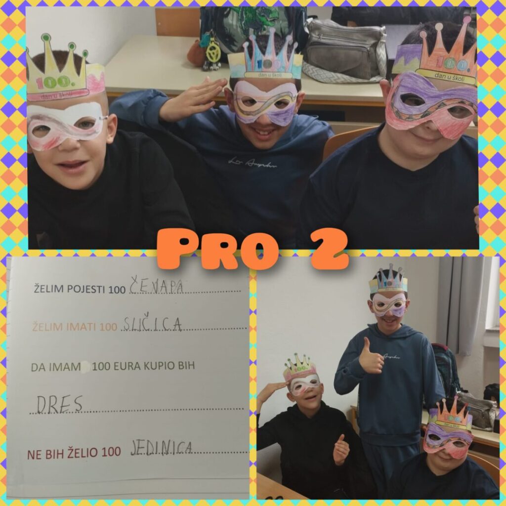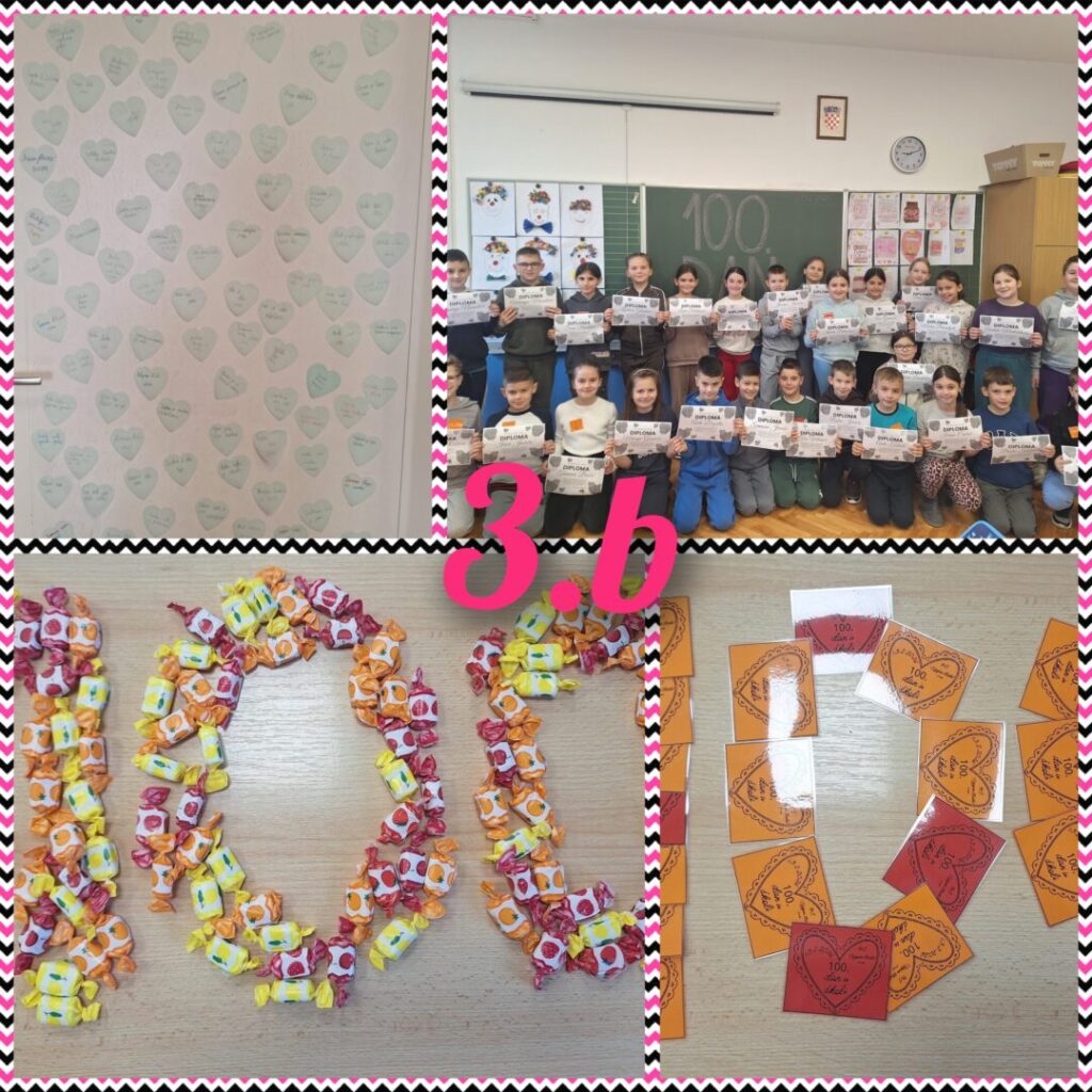 Stoti dan škole obilježava se tradicionalno u veljači u brojnim europskim zemljama, a cilj ovog projekta je okupiti učenike i učitelje osnovnih škola koji kroz odabrane sadržaje obilježavaju ovaj dan u školi. U našoj školi stoti dan škole obilježili su učenici razredne nastave i njihove učiteljice brojnim aktivnostima: pisanje sto riječi, crtanje sto geometrijskih likova, crtanje sebe kao stogodišnjaka, vježbanje po sto sekundi, šivanje srca od sto ušitaka, pjevanje himne stotog dana škole, računanje kako utrošiti 100 eura… Svi učenici na kraju ovog zanimljivog projektnog dana dobili su diplome.
