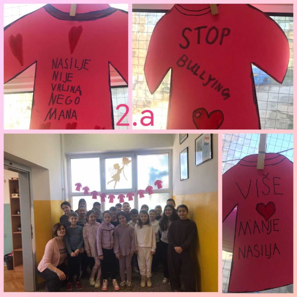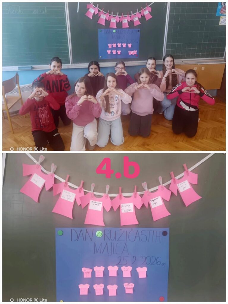 Dan ružičastih majica započeo je u Kanadi kao znak podrške učeniku koji je bio izložen izrugivanju jer je u školu došao odjeven u ružičastu majicu kao znak podrške svojoj majci oboljeloj od karcinoma dojke. U znak solidarnosti, njegovi su vršnjaci sljedećih dana također obukli ružičaste majice, šaljući snažnu poruku protiv nasilja i isključivanja. Danas se ova inicijativa obilježava diljem svijeta, pa tako i u Hrvatskoj. Dan ružičastih majica obilježili smo u našoj školi radionicama protiv nasilja na satovima razrednika i nošenjem ružičaste boje.
