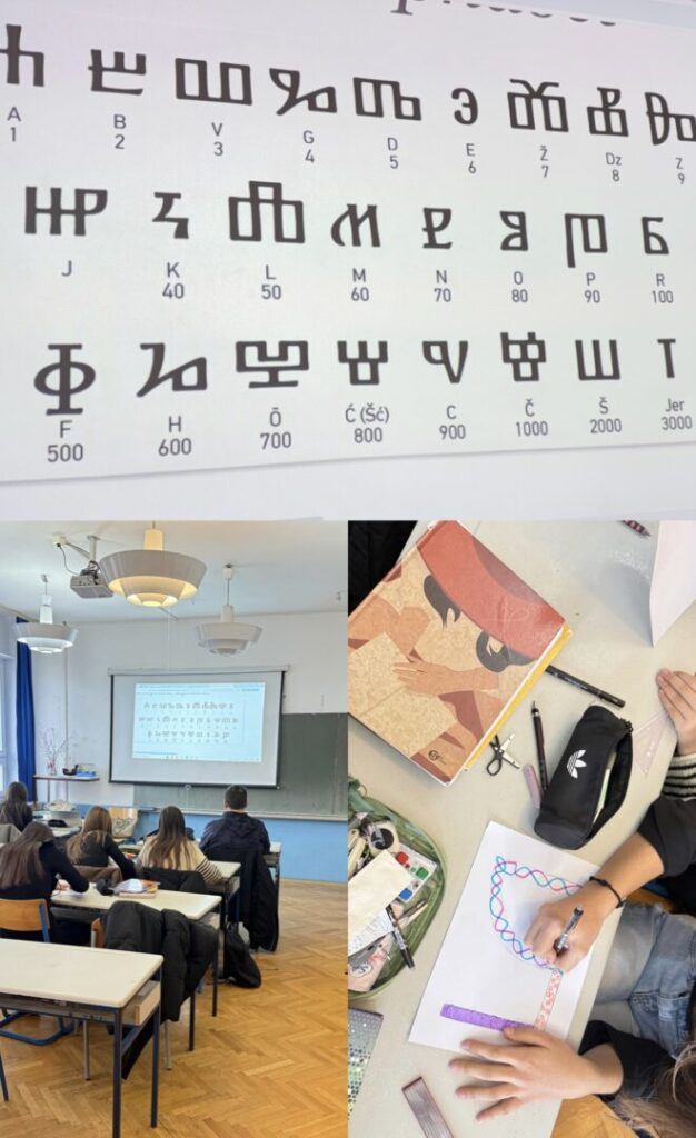 U našoj školi obilježavanje je provedeno kroz nastavu hrvatskoga jezika, gdje su se učenici upoznali s poviješću i značenjem glagoljice, njezinom posebnom ulogom u hrvatskoj kulturnoj baštini. Kroz razgovor, tekstove i nastavne aktivnosti učenici su imali priliku osvijestiti važnost očuvanja jezika i pisma kao dijela vlastitoga identiteta, ali ih potaknuti na kreativno izražavanje Profesorica Ivana Ruža Aračić
