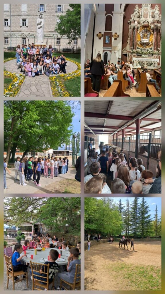 Najviše su se oduševili konjima u prirodnoj veličini, alkarima i oružju. Šetnju smo nastavili do Bazilike Gospe Sinjske gdje smo se pomolili i razgledali unutrašnjost. Pomalo umorni, ali veseli krenuli smo na Ranč Mustang gdje su nas čekali ljubazni domaćini i ručak. Nakon ukusnog ručka, učenici su se igrali, jahali konje uz stručnu pratnju i vrijeme je proletjelo. Na povratku smo posjetili stare mlinice koje pokreće snaga vode. Vrijedni mlinar nam je pokazao kako se dobiva brašno.
